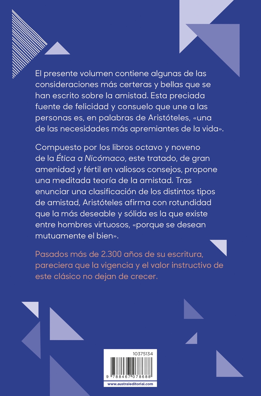 Un hermoso y valiosísimo tratado acerca de la amistad que revela toda su trascendencia. «Los amigos son el único asilo donde podemos refugiarnos en la miseria y en los reveses de todo género.»Este volumen contiene algunas de las consideraciones más certeras y bellas que se han escrito acerca de la amistad. Conforman la edición los libros octavo y noveno de la Ética a Nicómaco. En ellos la amistad se presenta como «una de las necesidades más apremiantes de la vida». Según su autor, la amistad más deseable y sólida es aquella que se da entre hombres virtuosos y está basada en el deseo del bien mutuo. Dos mil trescientos años más tarde, este tratado sorprende por su vigencia y porque se revela con más evidencia que nunca como un clásico.