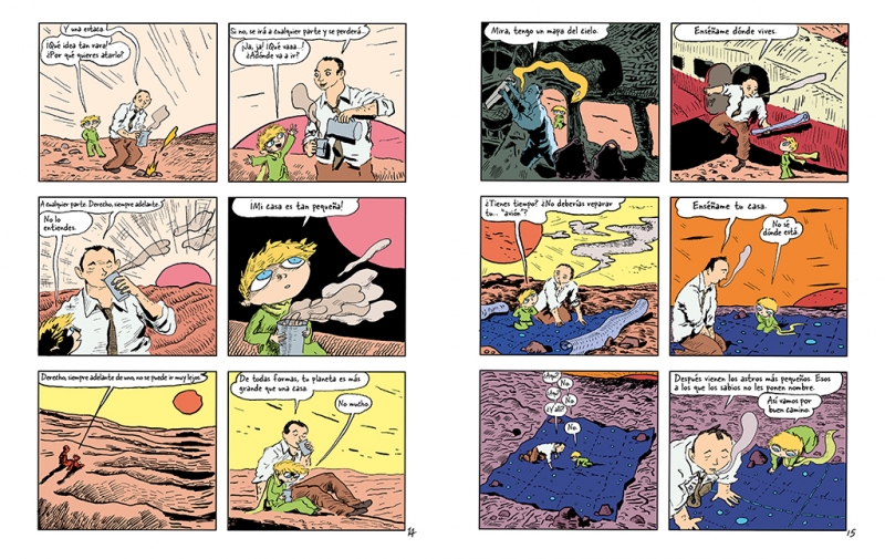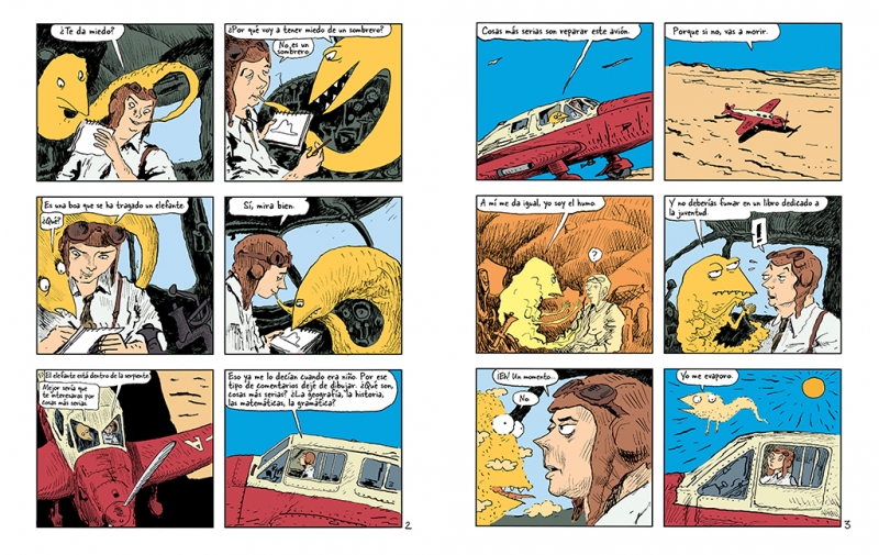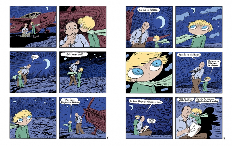 Viví así, solo, sin nadie con quien hablar verdaderamente, hasta que tuve una avería en el desierto del Sahara, hace seis años. Algo se había roto en mi motor. Y como no tenía conmigo ni mecánico ni pasajeros, me dispuse a realizar, solo, una reparación difícil. Era, para mí, cuestión de vida o muerte. Tenía agua apenas para ocho días. La primera noche dormí sobre la arena a mil millas de toda tierra habitada. Estaba más aislado que un náufrago sobre una balsa en medio del océano. Imaginaos, pues, mi sorpresa cuando, al romper el día, me despertó una extraña vocecita que decía: ùPor favor..., ¡dibújame un cordero!