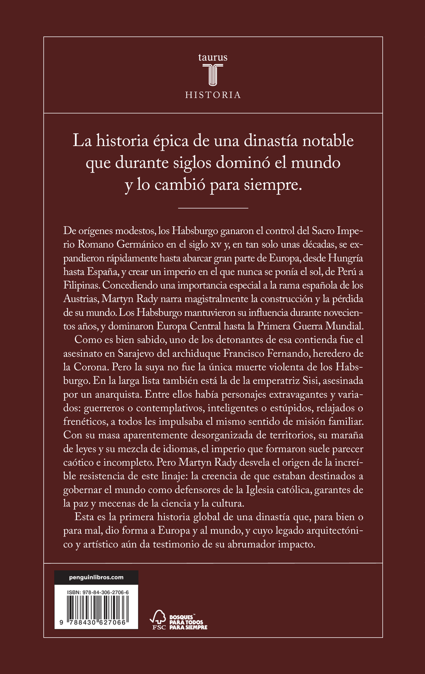 LA PRIMERA HISTORIA GLOBAL DE LA DINASTÍA QUE DOMINÓ EL MUNDO De orígenes modestos, los Habsburgo ganaron el control del Imperio romano en el siglo XV y, en tan solo unas décadas, se expandieron rápidamente hasta abarcar gran parte de Europa, desde Hungría hasta España, y crear un imperio en el que nunca se ponía el sol, de Perú a Filipinas. Concediendo una importancia especial a la rama española de los Austrias, Martyn Rady narra magistralmente la construcción y la pérdida de su mundo. Los Habsburgo mantuvieron su influencia durante novecientos años, y dominaron Europa Central hasta la Primera Guerra Mundial. Como es bien sabido, uno de los detonantes de esa contienda fue el asesinato en Sarajevo del archiduque Francisco Fernando, heredero de la Corona. Pero la suya no fue la única muerte violenta de los Habsburgo. En la larga lista también está la de la emperatriz Sisi, asesinada por un anarquista. Entre los Habsburgo había personajes extravagentes y variados: guerreros o contemplativos, inteligentes o estúpidos, relajados o frenéticos, a todos les impulsaba el mismo sentido de misión familiar. Con su masa aparentemente desorganizada de territorios, su maraña de leyes y su mezcla de idiomas, el imperio suele parecer caótico e incompleto. Pero Martyn Rady desvela el origen la increíble resistencia de este linaje: la creencia de que estaban destinados a gobernar el mundo como defensores de la Iglesia católica, garantes de la paz y mecenas de la ciencia y la cultura. Esta es la primera historia global de una dinastía que, para bien o para mal, dio forma a Europa y al mundo, y cuyo legado arquitectónico y artístico, repartido por todo el mundo, aún da testimonio de su abrumador impacto.La crítica ha dicho... «Probablemente el mejor libro jamás escrito sobre los Habsburgo en cualquier idioma.» Alan Sked, Times Literary Supplement «Un auténtico Rolls-Royce: su narrativa recorre diez siglos de historia con tal sencillez aparente que disimula la potencia intelectual que hay bajoel capó. Por si esto fuera poco, arroja casi tanta luz sobre el presente como sobre el pasado.» John Adamson, Literary Review «Apasionante, vibrante y dramático. Martyn Rady revela a un actor clave en la historiadel mundo durante casi mil años. Una historia de proporciones épicas.» Simon Sebag Montefiore, autor de Los Romanov «Los Habsburgo, con su elenco de personajes dementes, variopintos y profundamente defectuosos, son un regalo para un escritor, y el libro de Rady le saca partido.» Mark Mazower, Financial Times«Lúcido y elegante: ojalá todos los historiadores siguieran su ejemplo de concisión. Es imposible imaginar una historia más sabia e incisiva de esta dinastía fascinante y trágica.» Paul Lay, The Sunday Times «Magnífico. Su erudición resulta natural, nunca se atasca en detalles, su prosa es lúcida y condimenta la narración con elocuentes anécdotas.» Rupert Christiansen, Daily Telegraph «Rady devuelve a los Habsburgo su lugar en el centro de la historia europea. Ameno, inteligente, colorido y repleto de detalles memorables.» Dominic Sandbrook, The Sunday Times «Lúcido y entretenido. Rady es tan bueno con el legado artístico y cultural de los Habsburgo como con la parte política.» David Crane, The Spectator «Basándose en estudios internacionales muy recientes, Rady ofrece un texto accesible y entretenido. Su mente ágil ofrece un contrapunto delicioso a la notoria falta de humor de muchos de los monarcas que examina.» Robert Evans, historiador británico