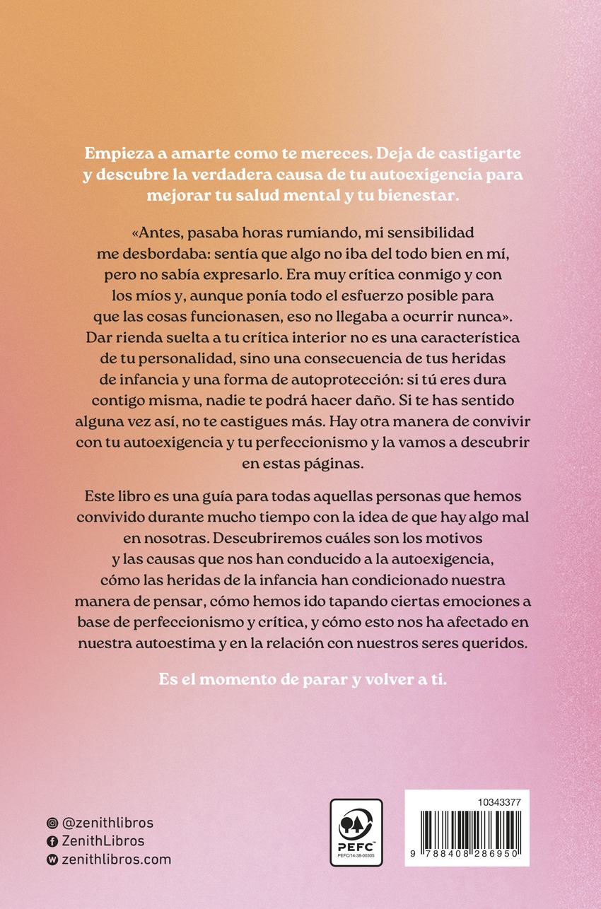 Vuelve a ti nos descubre un nuevo camino para hacer las paces con el perfeccionismo y la autoexigencia y así cultivar una relación sana con una misma y con los demás.«Antes, pasaba horas rumiando, mi sensibilidad me desbordaba: sentía que algo no iba del todo bien en mí, pero no sabía expresarlo. Era muy crítica conmigo y con los míos y, aunque ponía todo el esfuerzo posible para que las cosas funcionasen, eso no llegaba a ocurrir nunca». Dar rienda suelta a tu crítica interior no es una característica de tu personalidad, sino una consecuencia de tus heridas de infancia y una forma de auto protección: si tú eres dura contigo misma, nadie te podrá hacer daño. Si te has sentido alguna vez así, no te castigues más: hay otra manera de convivir con tu autoexigencia y tu perfeccionismo y lo vamos a descubrir en estas páginas. Este libro es una guía para todas aquellas personas que hemos convivido durante mucho tiempo con la idea de que hay algo mal en nosotras. Descubriremos cuáles son los motivos y las causas que nos han conducido a la autoexigencia; cómo las heridas de la infancia nos han condicionado nuestra manera de pensar; cómo hemos ido tapando ciertas emociones a base de perfeccionismo y crítica y cómo esto nos ha afectado en nuestra autoestima y en la relación con nuestros seres queridos. Es el momento de parar y volver a ti. Aprovecha estas páginas para redescubrirte y convertirte en tu mejor aliada.
