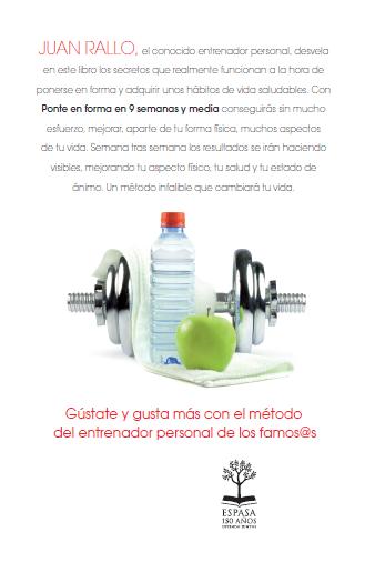 Juan Rallo ha predicado con el ejemplo al ser la primera persona en experimentar en su propio cuerpo su método para ponerse en forma. En 2007 pasó de pesar 90 kilos a lucir una perfecta tableta de chocolate en solo 3 meses, tras el éxito de este revolucionario método de entrenamiento, en 2008 el presentador Pablo Motos aceptó el reto de Juan Rallo y se puso en sus manos con resultados espectaculares, en 2009 fue el también presentador Christian Gálvez quien decidió mejorar su aspecto y endurecer su cuerpo con entrenador de los famosos.Juan Rallo desvela en este libro los secretos que realmente funcionan a la hora de ponerse en forma y adquirir unos hábitos de vida saludables. Con Ponte en forma en 9 semanas y media conseguirás sin mucho esfuerzo, mejorar, aparte de tu forma física, muchos aspectos de tu vida. Semana tras semana los resultados se irán haciendo visibles, mejorando tu aspecto físico, tu salud y tu estado de ánimo. Un método infalible que cambiará tu vida.Juan Rallo ha revolucionado el mundo de la salud y del entrenamiento personal en España, al trasladar el sistema de entrenamiento de las estrellas al público general. Ha realizado acciones destacadas en televisión como colaborador de ?El hormiguero?, y en prensa y Men´s Health, donde realizó el reto de poner en forma a Pablo Motos y a Christian Gálvez en cuatro meses. Con estas acciones Juan ha demostrado al público que cualquiera, sea famoso o no, si está bien asesorado, es capaz de mejorar drásticamente su forma y con ello su calidad de vida.