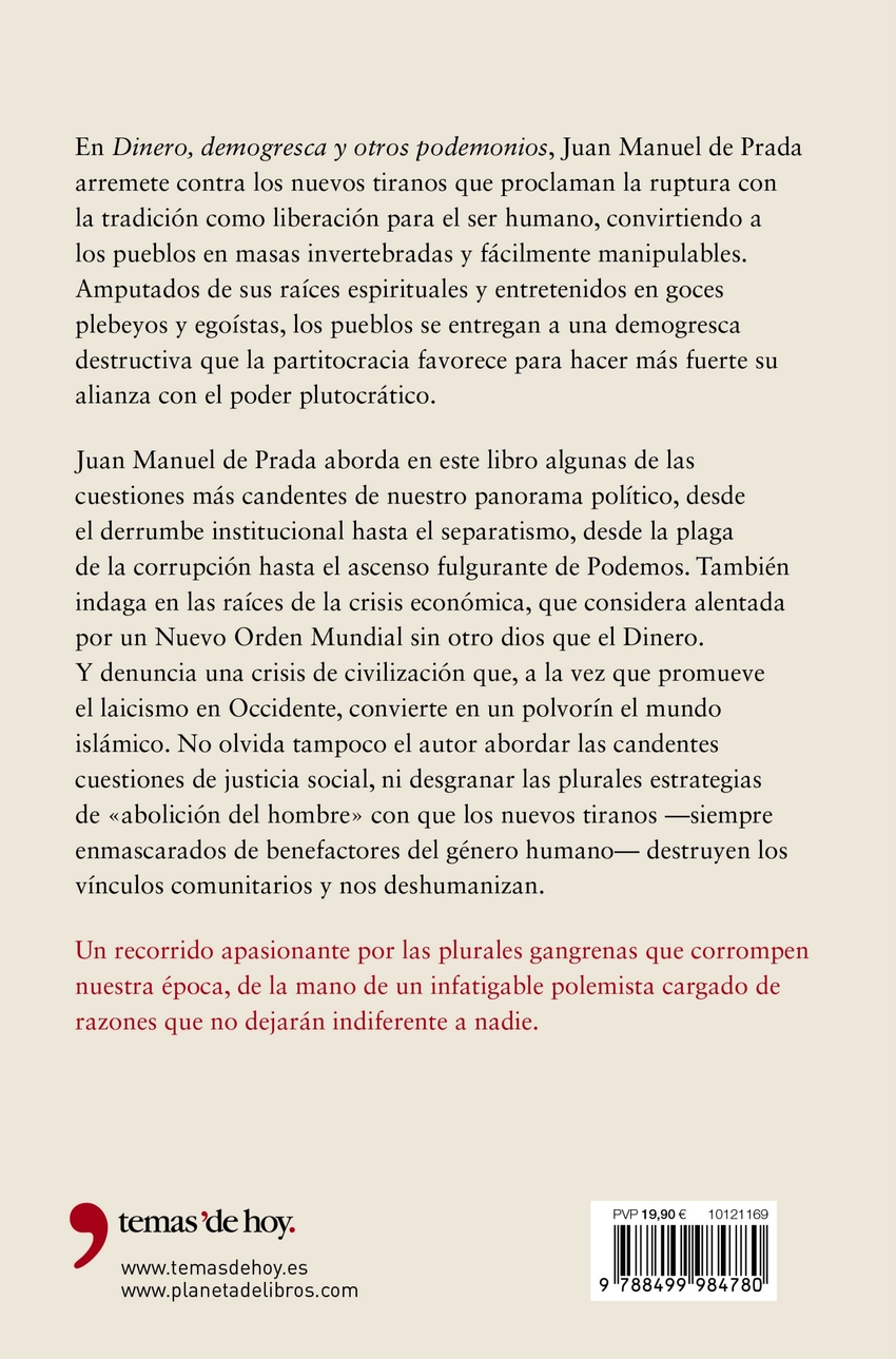 En Dinero, demogresca y otros podemonios, Juan Manuel de Pradaarremete contra los nuevos tiranos que proclaman la ruptura conla tradición como liberación para el ser humano, convirtiendo alos pueblos en masas invertebradas y fácilmente manipulables.Amputados de sus raíces espirituales y entretenidos en gocesplebeyos y egoístas, los pueblos se entregan a una demogrescadestructiva que la partitocracia favorece para hacer más fuerte sualianza con el poder plutocrático.Juan Manuel de Prada aborda en este libro algunas de lascuestiones más candentes de nuestro panorama político, desdeel derrumbe institucional hasta el separatismo, desde la plagade la corrupción hasta el ascenso fulgurante de Podemos. Tambiénindaga en las raíces de la crisis económica, que considera alentadapor un Nuevo Orden Mundial sin otro dios que el Dinero.Y denuncia una crisis de civilización que, a la vez que promueveel laicismo en Occidente, convierte en un polvorín el mundoislámico. No olvida tampoco el autor abordar las candentescuestiones de justicia social, ni desgranar las plurales estrategiasde «abolición del hombre» con que los nuevos tiranos ?siempreenmascarados de benefactores del género humano? destruyen losvínculos comunitarios y nos deshumanizan.