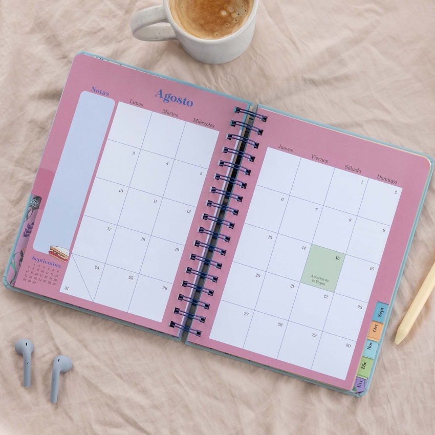María Hesse te invita a disfrutar de los placeres de vida este 2026.Esta agenda 2026 quiere ser para ti algo más que una herramienta de organización: quiere ser esa vocecilla interior que te recuerda que no hace falta que llegues a todo. Que está bien parar, respirar, improvisar y también disfrutar. Con un estudiado diseño e ilustraciones que celebran la belleza de lo cotidiano, te acompañará a lo largo del año con doce propuestas que alivian, inspiran y te devuelven el foco a lo esencial: vivir con menos autoexigencia y más placer. Cada mes incluye un espacio para crear tus propios propósitos antipropósitos, pequeñas metas alcanzables y disfrutonas como comerte una pizza viendo tu serie favorita, regalarte flores o quedar con amigas. En su interior encontrarás amplios espacios semana vista, perfectos para anotar reuniones, tareas, exámenes o planes y también un recuadro semanal para apuntar el capricho que te quieras dar. Incluye además páginas para tus listas de libros, pelis y canciones favoritas, un calendario menstrual para llevarlo todo bajo control, sin agobios, hojas de pegatinas y póstits y un bolsillo doble. Una agenda práctica, inspiradora y llena de buen rollo, que hará que el 2026 sea un año más amable contigo. Características: Formato: 16,8 x 22,8 cm. Formato interior 16,4 x 22,2 cm. 176 páginas. 1 página con tacos de pósits. 4 páginas de adhesivos. Bolsillo doble. Goma de cierre. Pestañas plastificadas. Esquinas redondeadas. Tapa dura. Estamping rosa metalizado en la portada. Wire-o.