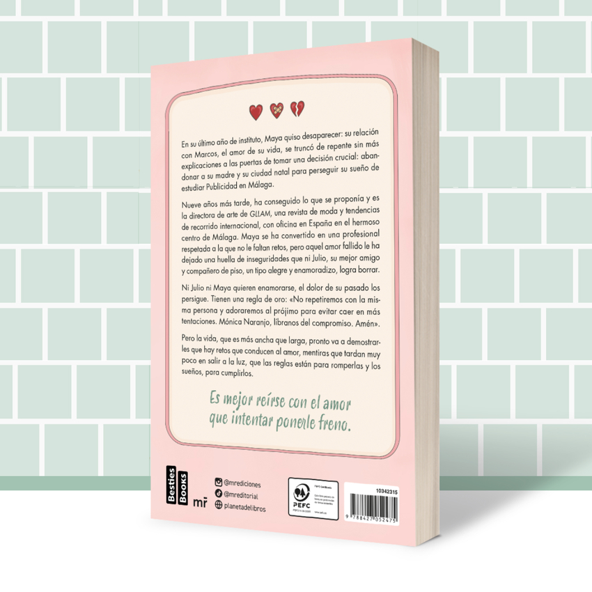 ¿Es posible crear una regla para salir ilesos de una relación Sí, no repetir cita con el mismo hombre.En su último año de instituto, Maya quiso desaparecer: su relación con Marcos, el amor de su vida, se truncó de repente sin más explicaciones a las puertas de tomar una decisión crucial: abandonar a su madre y su ciudad natal para perseguir su sueño de estudiar Publicidad en Málaga. Nueve años más tarde, ha conseguido lo que se proponía y es la directora de arte de GLLAM, una revista de moda y tendencias de recorrido internacional, con oficina en España en el hermoso centro de Málaga. Maya se ha convertido en una profesional respetada a la que no le faltan retos, pero aquel amor fallido le ha dejado una huella de inseguridades que ni Julio, su mejor amigo y compañero de piso, un tipo alegre y enamoradizo, logra borrar. Ni Julio ni Maya quieren enamorarse, el dolor de su pasado los persigue. Tienen una regla de oro: «No repetiremos con la misma persona y adoraremos al prójimo para evitar caer en más tentaciones. Mónica Naranjo, líbranos del compromiso. Amén». Pero la vida, que es más ancha que larga, pronto va a demostrarles que hay retos que conducen al amor, mentiras que duran muy poco en salir a la luz, que las reglas están para romperlas y los sueños, para cumplirlos. Que es mejor reírse con el amor que intentar ponerle freno. Los lectores opinan «Toni mezcla la sensibilidad con el humor de una manera mágica. Amor, amistad, familia y verdad son los ingredientes perfectos para convertirse en una de esas novelas que te llegan al corazón», Cristina Mellado @filologalectora «Una historia para reír y emocionarse desde la primera página, que intercala humor y drama con una evolución de personajes maravillosa y reflexiones que tocan el corazón. ¡No podrás dejar de leer!», Jen Bernal @devoralibrosyt «Divertida, adictiva y sorprendente. Querrás ser uno más en la vida de los protagonistas para poder acompañarlos en sus aventuras. Menuda primera novela», Susanna Herrero @herrerosusanna «Una historia para reír, llorar y enfrentarse al amor. Nos muestra los caprichos del destino y los desafíos de la vida. Más que recomendada», Jon Azkueta @jonazkueta «Este libro me ha hecho reír, llorar y sorprenderme a partes iguales. ¡Prepárate para disfrutar de un intenso y original cóctel de sensaciones!», Lena Blau @lenablau_escritora «Esta novela te hará feliz. Viajaras a Málaga con Julio y Maya en una aventura de amor, travesuras, miedos, tristeza y amistad. Reflexionarás sobre eso que tienes guardado y disfrutarás con lo que el amor puede depararte», Melu @booksbymelu «Una historia cautivadora, narrada con suma delicadeza, pero con esa esencia vital tan propia de Toni», May Boeken @mayboeken «Dos amigos. Una promesa. Y un sinfín de casualidades. Una entretenidísima historia de amor que te atrapará página tras página», Susana Rubio @susanarubiowriter